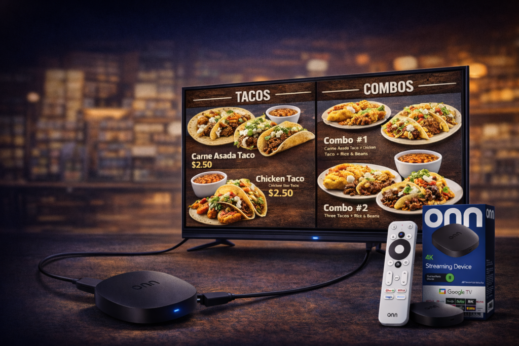 Un TV (ej. 28, 32, 40, 50”), conexión a internet y electricidad. Nosotros enviamos el dispositivo configurado.